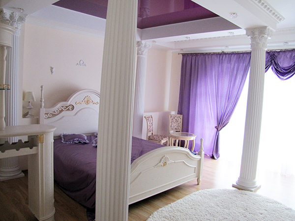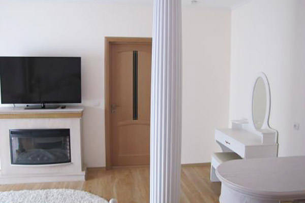 2 осн. места. Мебель: вешалка, зеркало, кровать двуспальная, набор мягкой мебели, прикроватные тумбочки, стол, столик туалетный, стулья, шкаф. Оборудование: камин, набор посуды, телевизор ЖК, холодильник, электрочайник. Санузел: с джакузи, туалетные принадлежности, фен. Сервис: смена полотенец (1 раз в неделю), смена постельного белья (1 раз в неделю), уборка номера (ежедневно).