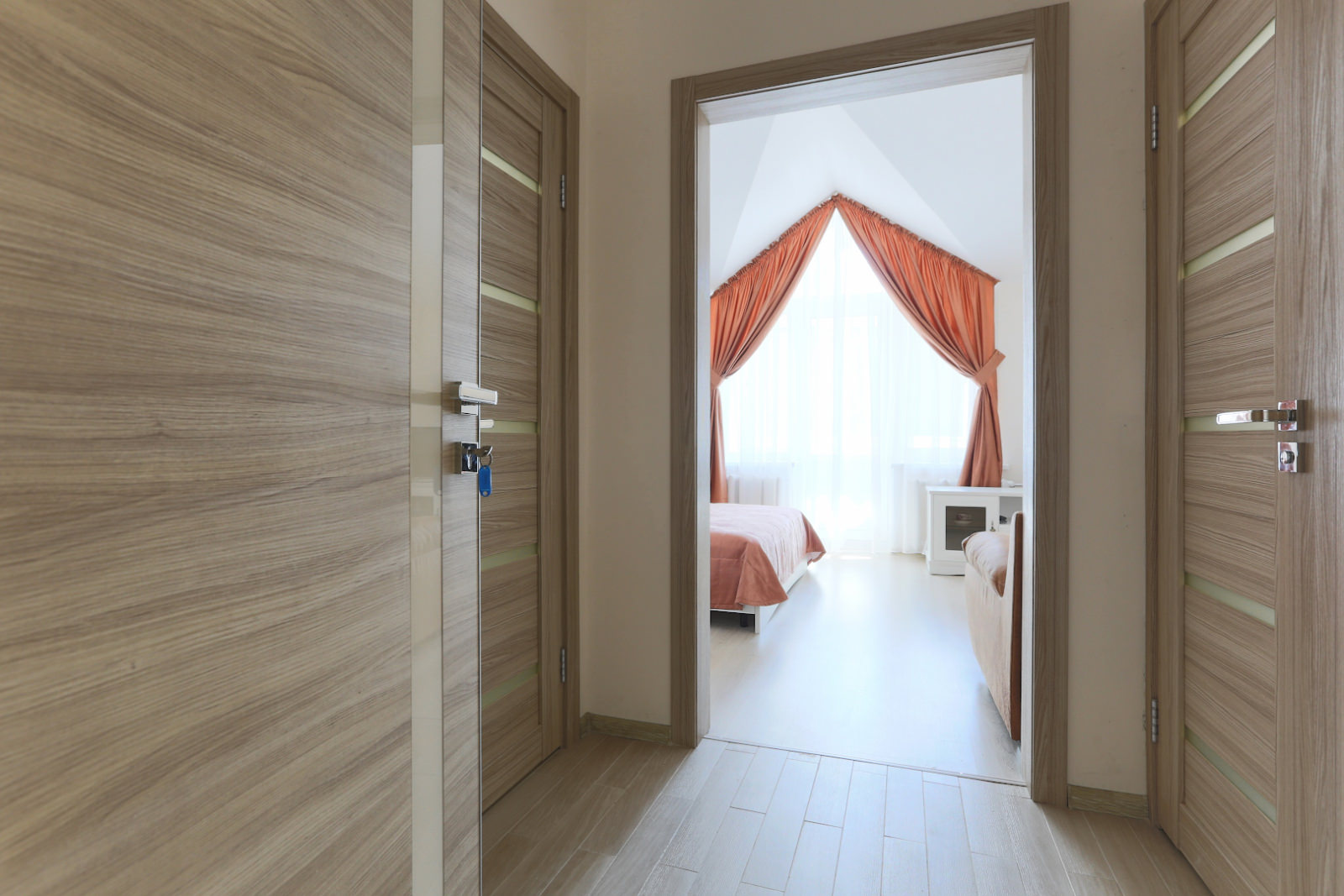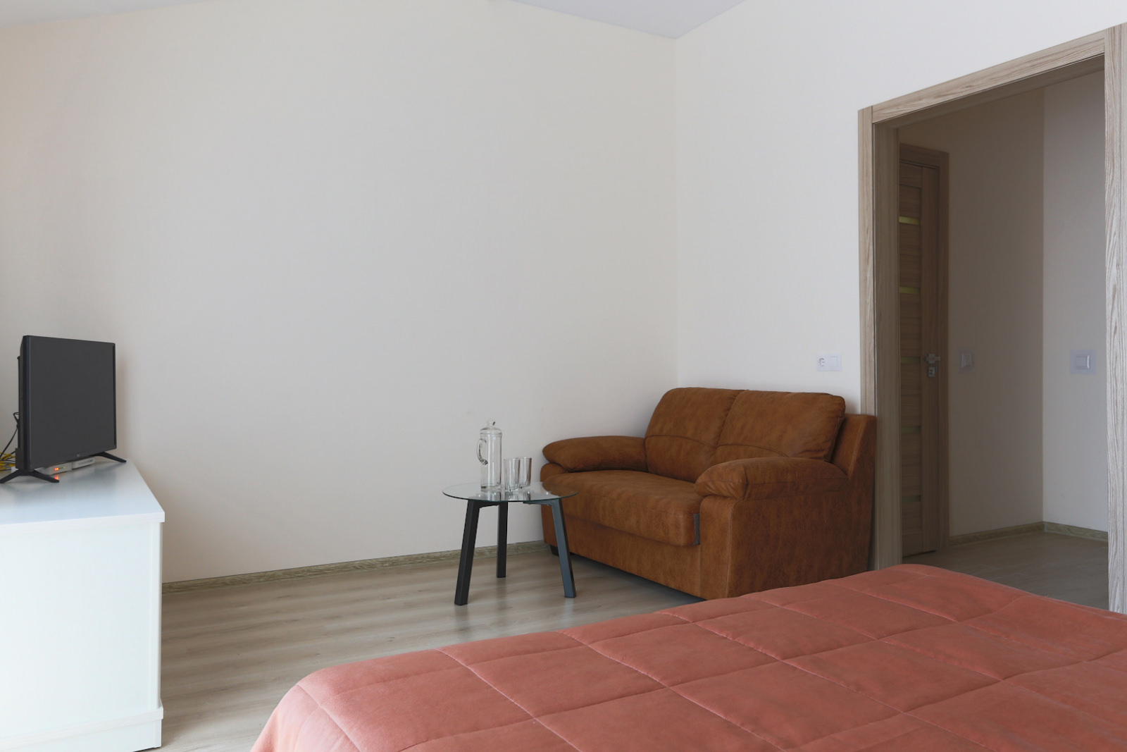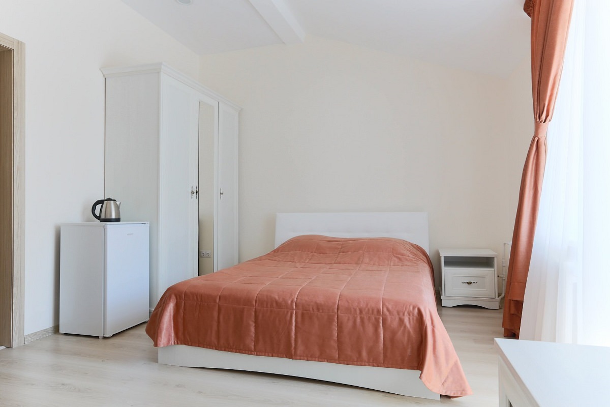 Площадь номера - 25,8 кв.м. 3 осн. места. Балкон. Мебель: вешалка, диван раскладной, зеркало, кровать двуспальная, прикроватные тумбочки, стол, стулья, тумба под телевизор, шкаф. Оборудование: набор посуды, телевизор ЖК, холодильник, электрочайник. Санузел: с душевой кабиной, туалетные принадлежности, фен. Сервис: смена полотенец (1 раз в неделю), смена постельного белья (1 раз в неделю), уборка номера (ежедневно).
